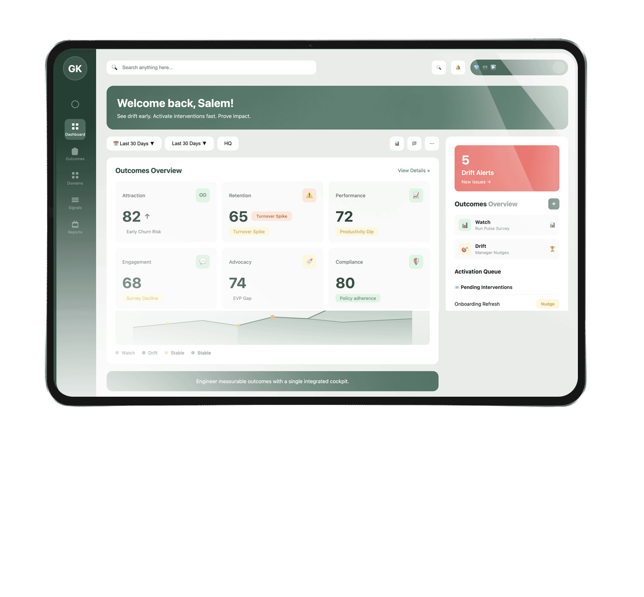 Many organizations run people initiatives as isolated projects. GoldinKollar builds an integrated system and gives leadership a single command center to operate it.